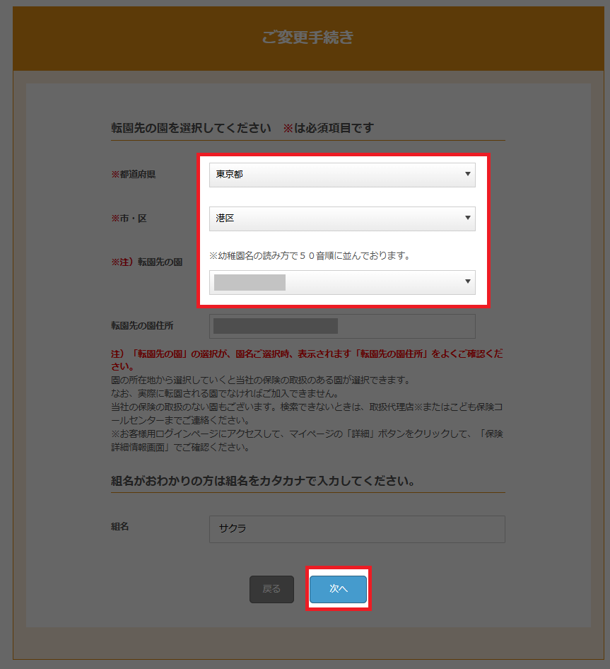 リストから転園先の情報を入力し、次へボタンをクリックします。