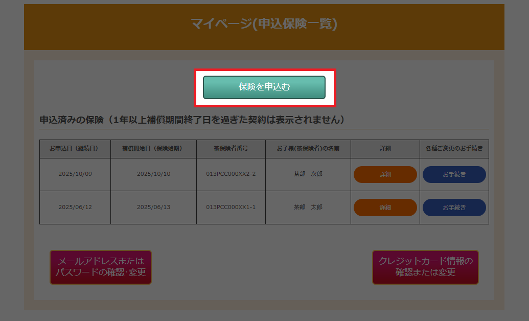 保険契約一覧にある保険を申込むボタンをクリックします。