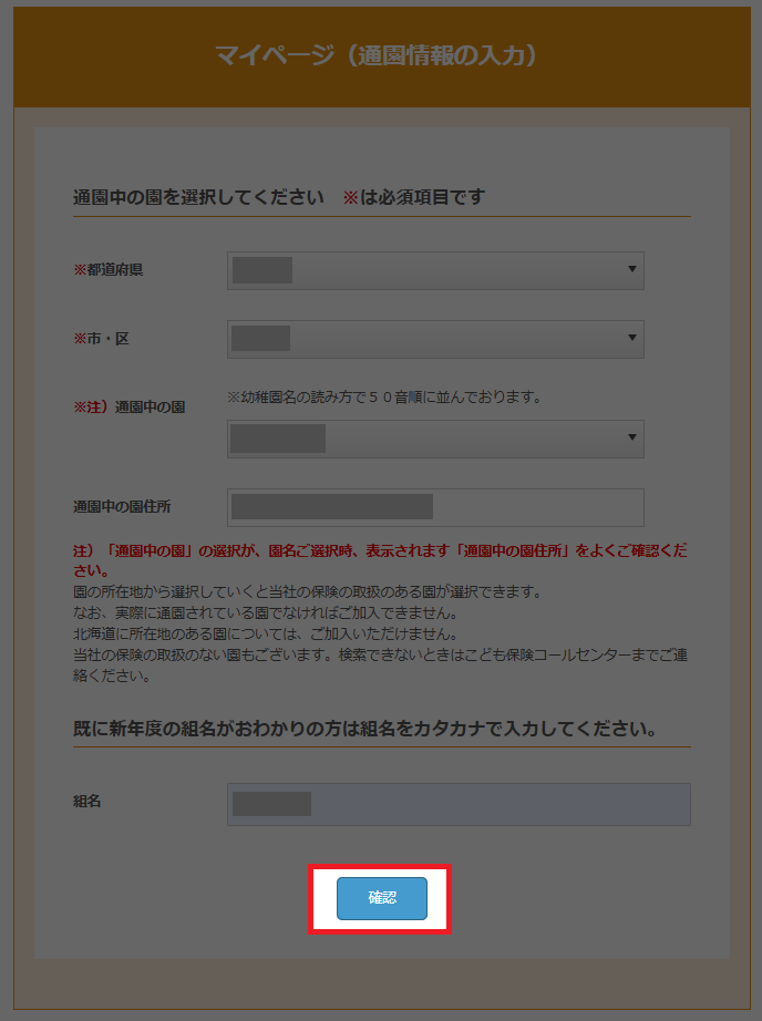 お子様が通園している園を所在地から絞り込み、選択します。 選択後、確認ボタンをクリックします。