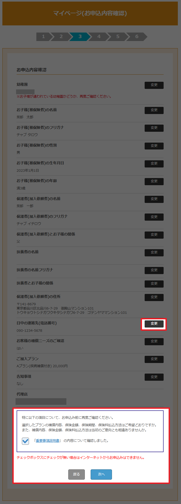 入力したお申込内容を確認します。修正する場合は変更ボタンをクリックします。重要事項説明書をご確認、チェックを入れて次へボタンをクリックします。