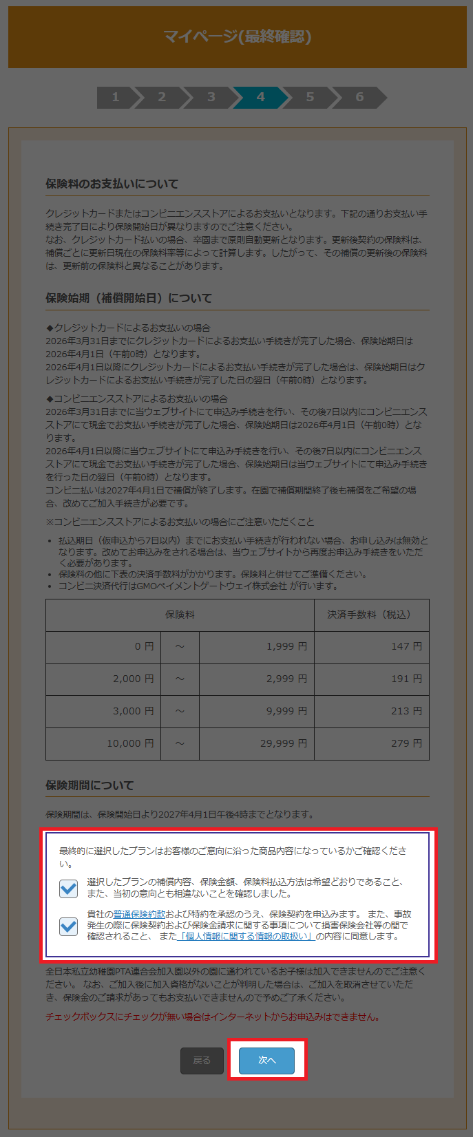 保険契約に関する説明をご確認後、内容にご同意いただける場合はチェックを入れて、次へボタンをクリックします。