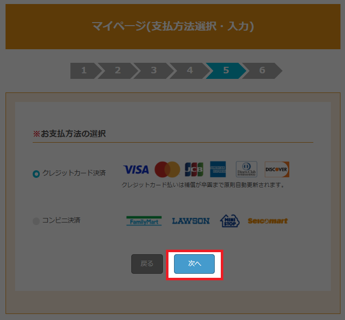 お支払方法(クレジットカード決済、コンビニ決済)を選択後、画面の指示に従い、必要な情報を入力して支払いを完了させます。