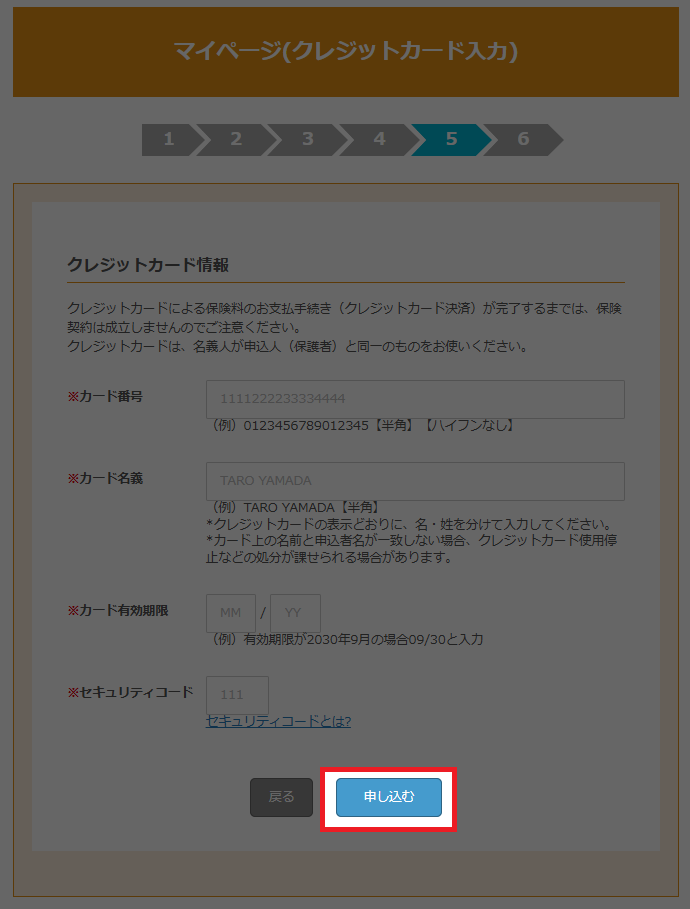 お支払いのクレジットカードを入力し、申し込むボタンをクリックします。