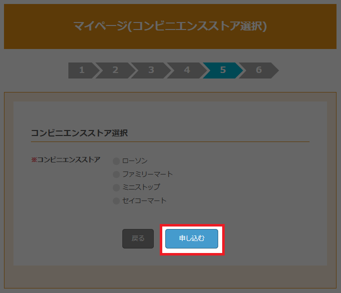 お支払いするコンビニエンスストアを選択し、申し込むボタンをクリックします。