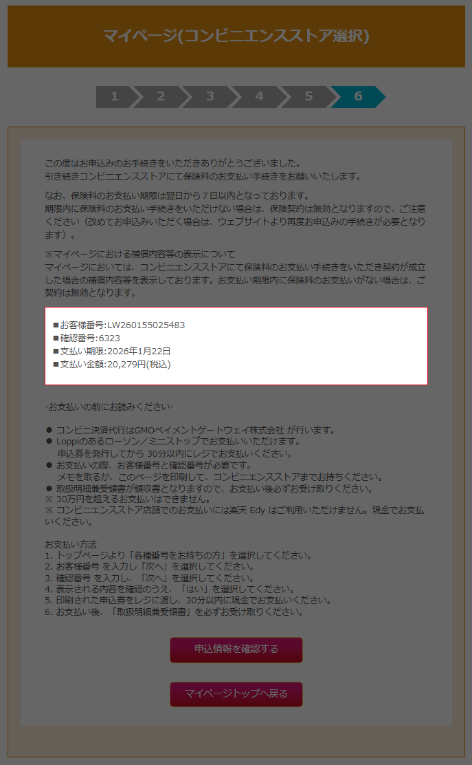 お申込み完了画面が表示されます。 「ご加入受付とお支払いのご案内」メールが送信されますので、ご指定のコンビニエンスストアーより、入金手続きを行ってください。