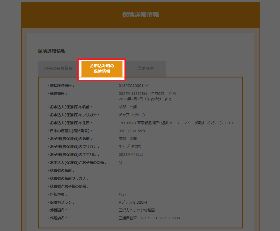保険詳細情報の上部にあるお申込み時の保険情報タブをクリックします。