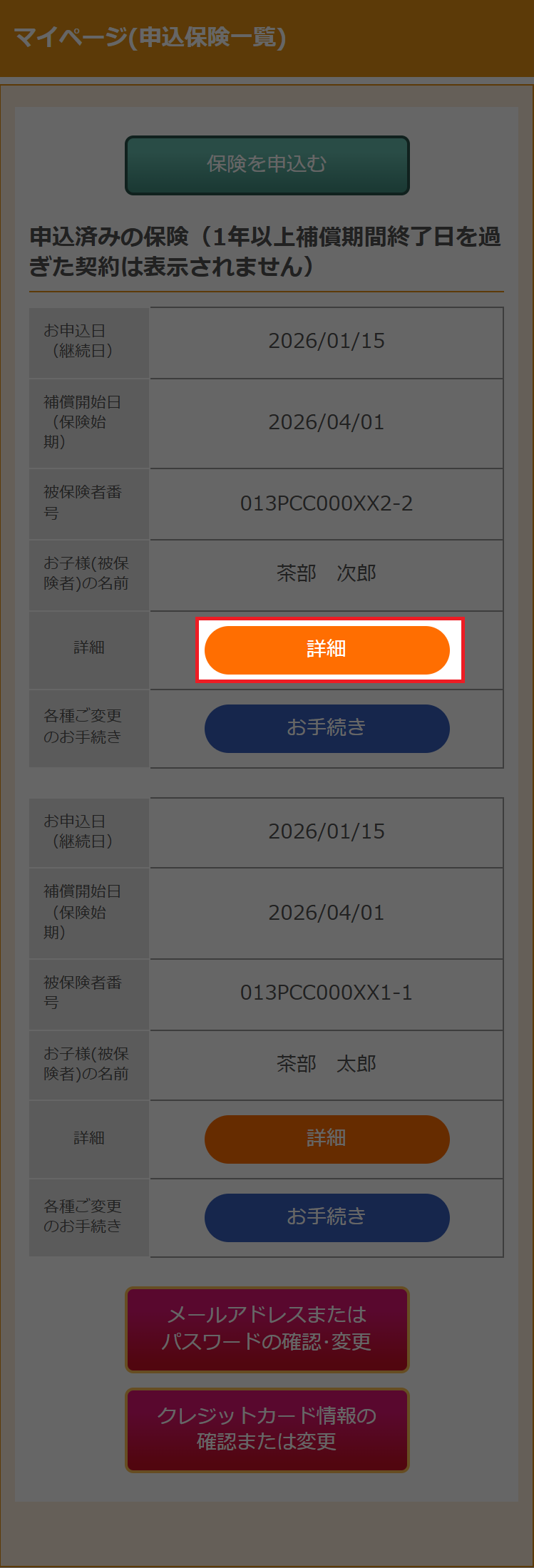申込保険一覧から契約を選択し、詳細ボタンをクリックします。
