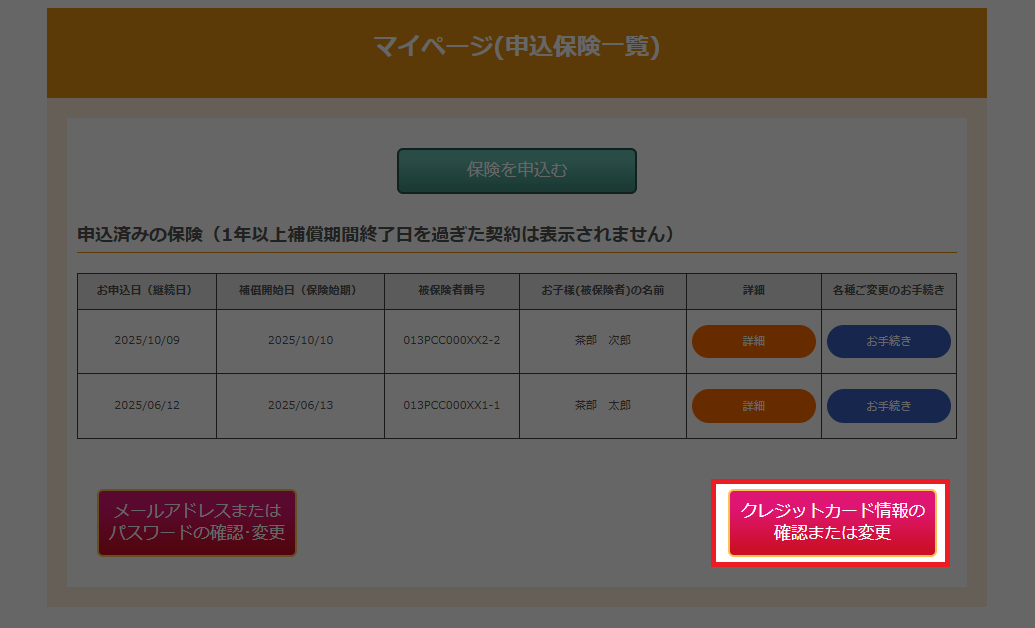 ログイン後、マイページ(申込保険一覧)画面の下より、メールアドレスまたパスワードの確認・変更ボタンをクリックします。