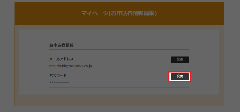 現在のパスワードと変更後のメールアドレスを入力し、会員情報の変更ボタンをクリックします。